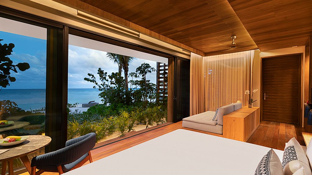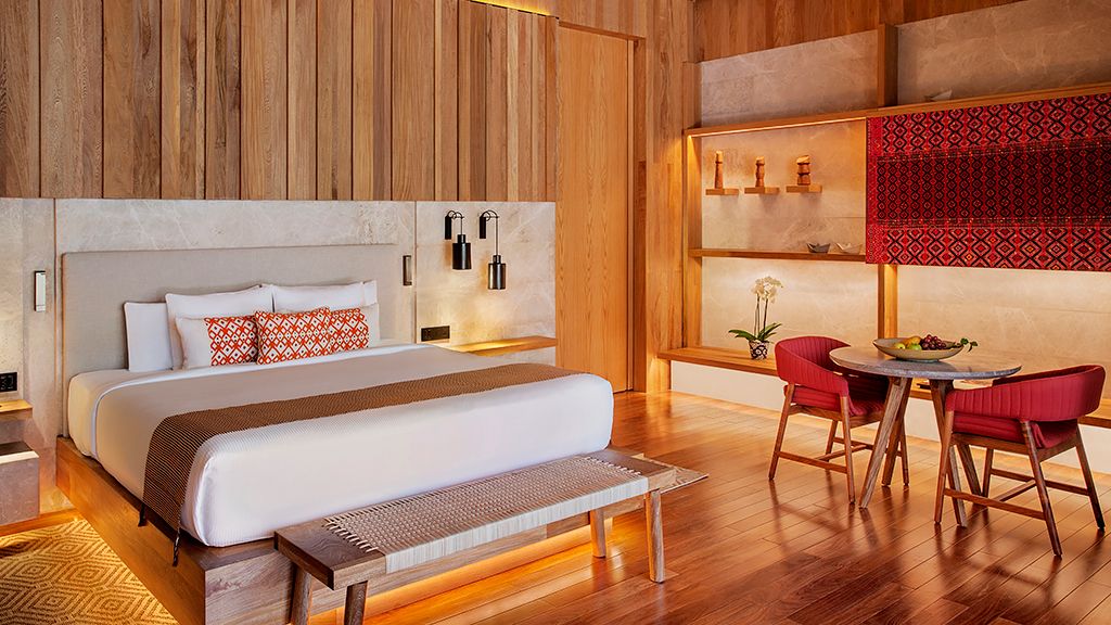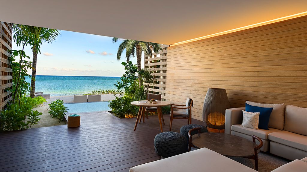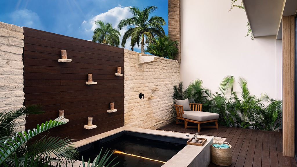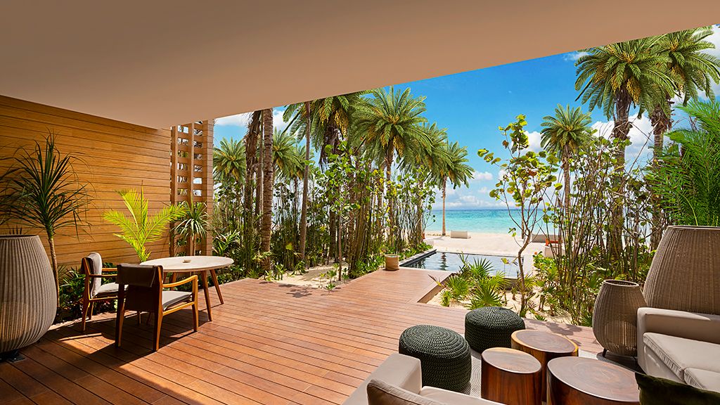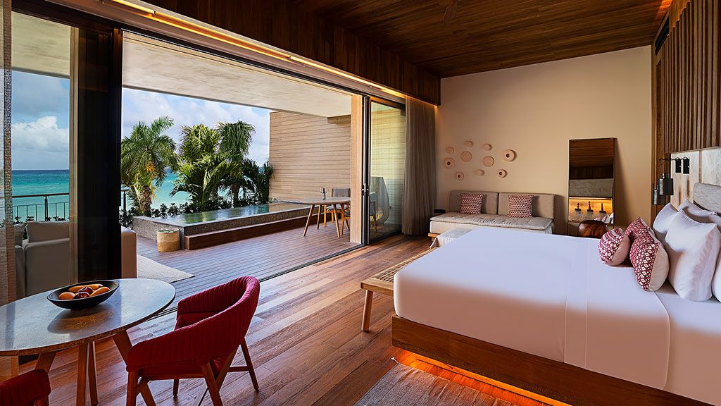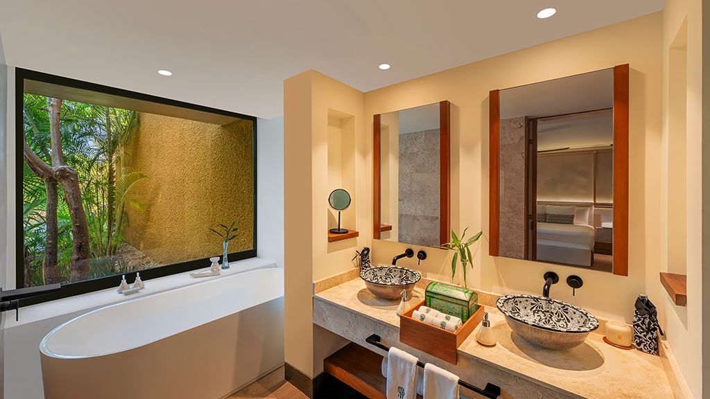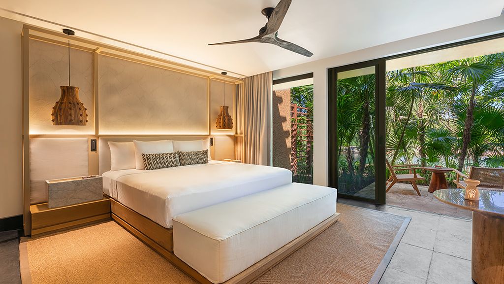 Sitting upon the sugar sand beach of Mayakoba and featuring unhindered views of the shimmering sea, the exquisitely appointed one-bedroom suite offers an exclusive selection of services and amenities. Featuring a heated private plunge pool, an interior patio and an organically-infused atmosphere, this suite is the ideal nest to connect with your loved ones to the sway of the ocean breeze.