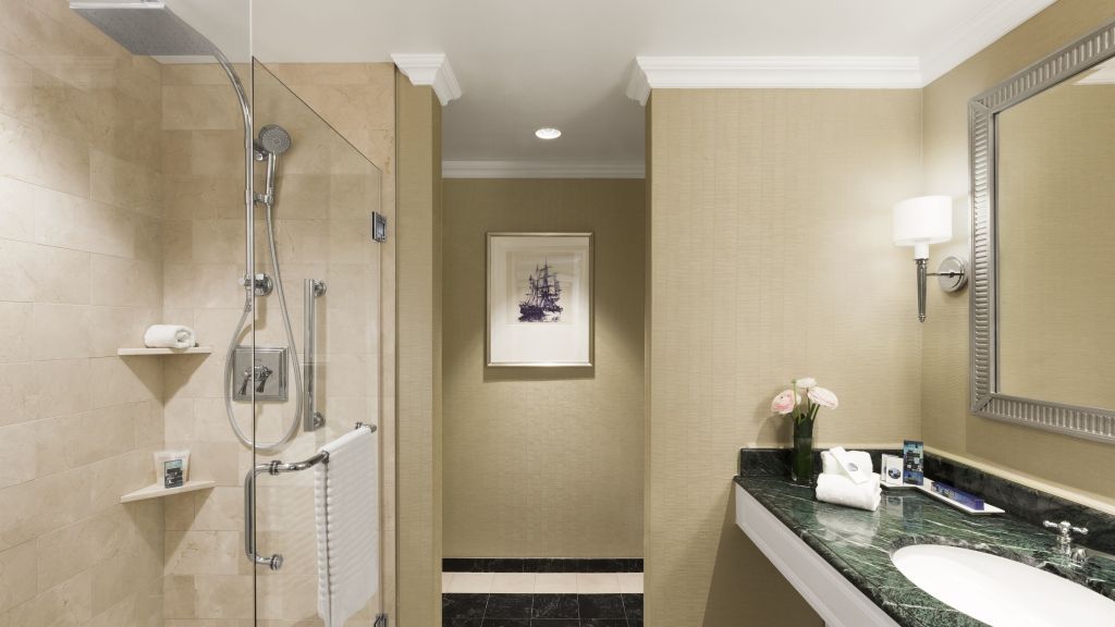 Spacious king guestroom with king bed, executive desk, and armchair featuring views of the rose kennedy greenway and city skyline marble bathroom with a rainfall shower and diptyque bath products luxurious frette linens, bathrobes, and slippers lg smart tv and complimentary wireless high-speed internet personal ipad with access to hotel services and amenities in-room dining and premium minibar complimentary access to the rowes wharf health club ada-accessible rooms are available upon request
