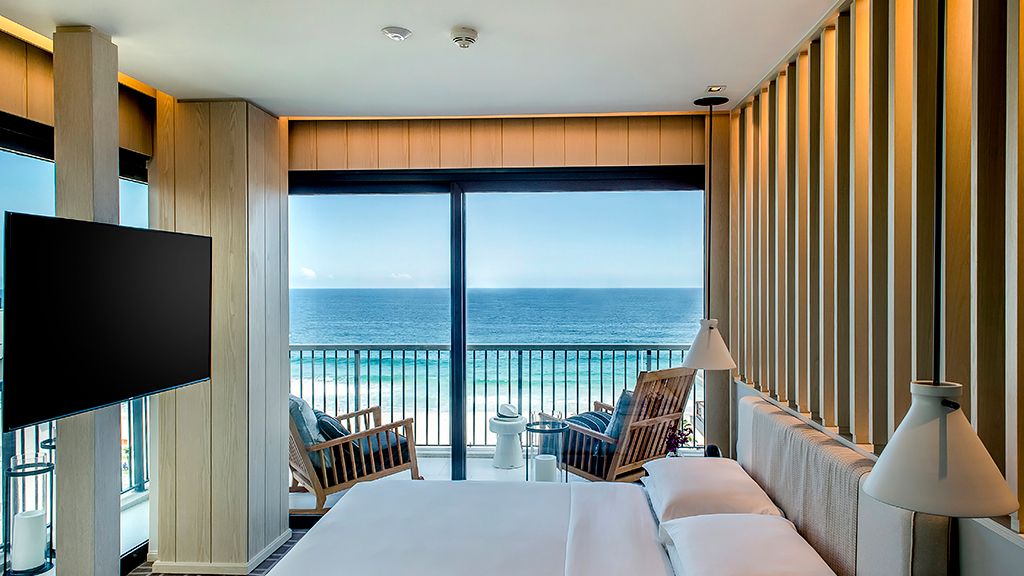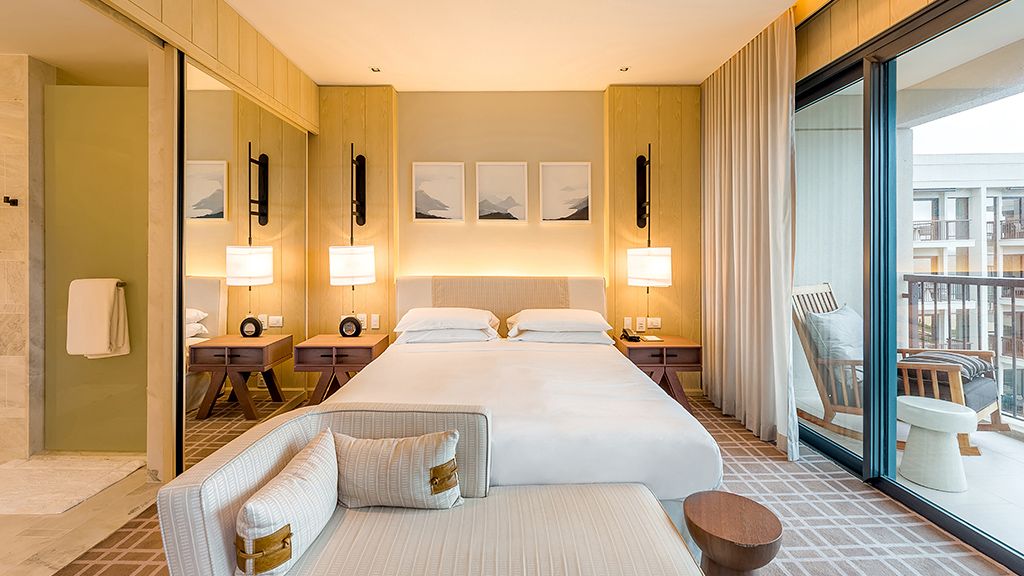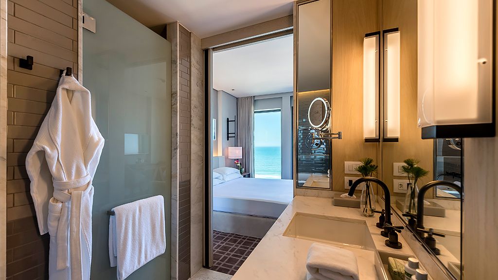 Live a unique experience in this room that features a plush king bed, a private balcony with a sea view, a desk, and a bathroom with a separate immersing bathtub and shower.