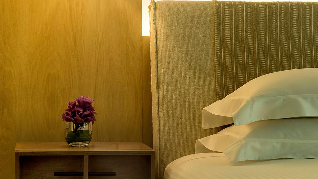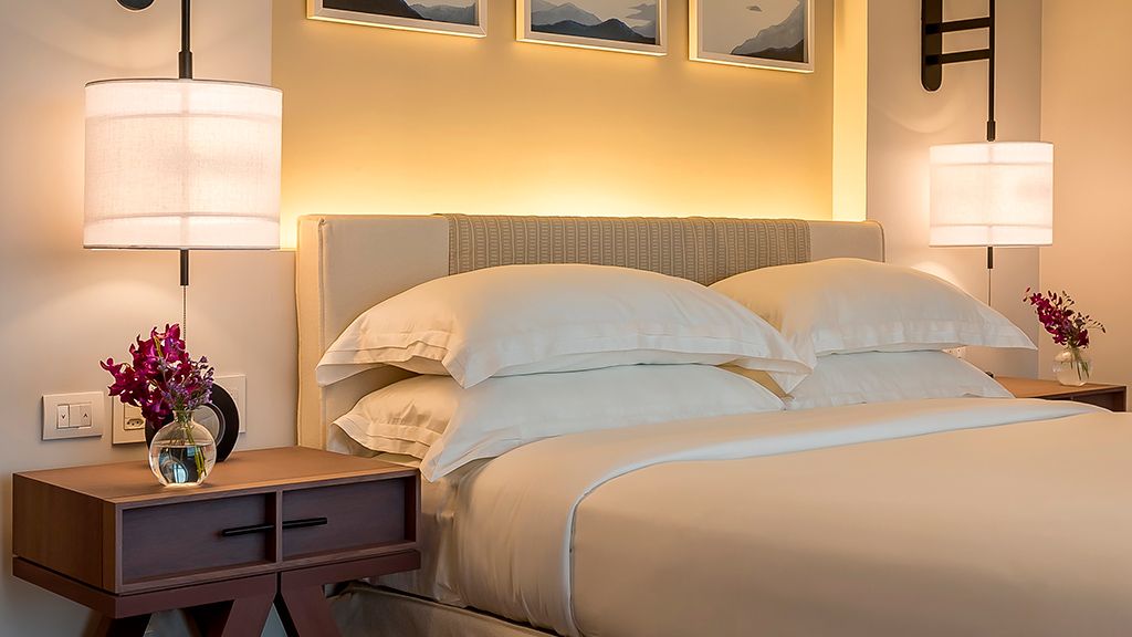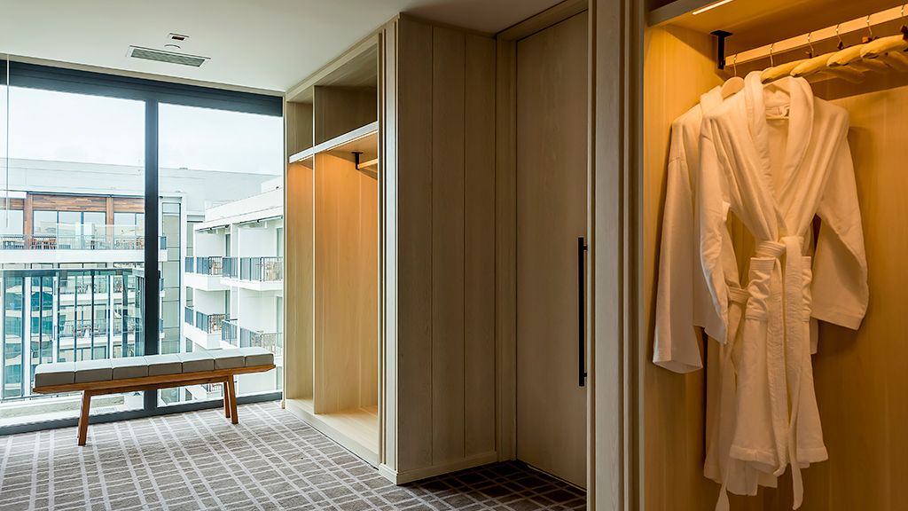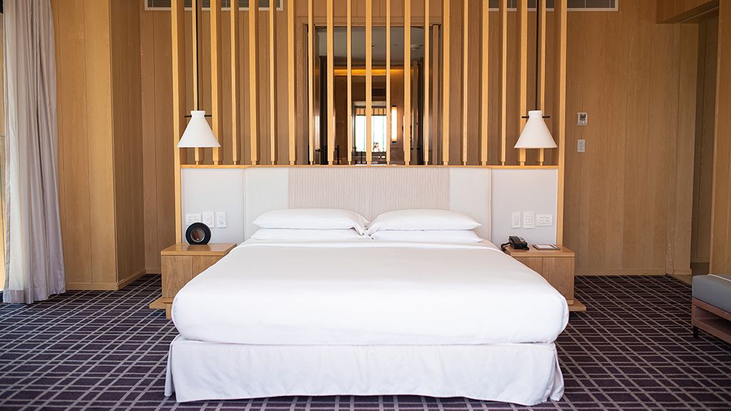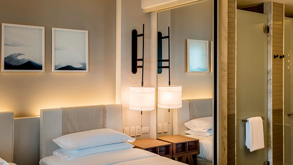 Sprawl out in this large space, comprised of two connected rooms: one with a plush king bed and another with two plush twin beds. Floor-to-ceiling windows, a private balcony with a courtyard view, a desk, and a large bathroom with a separate bathtub and shower complete the space.