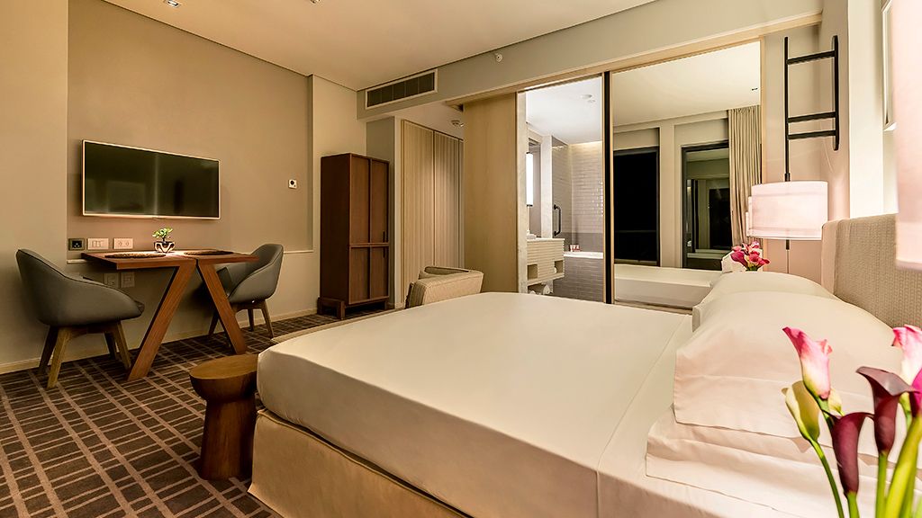 Relax in this spacious room that features a plush king bed, a private balcony, a desk and a bathroom with a separate immersing bathtub and shower.