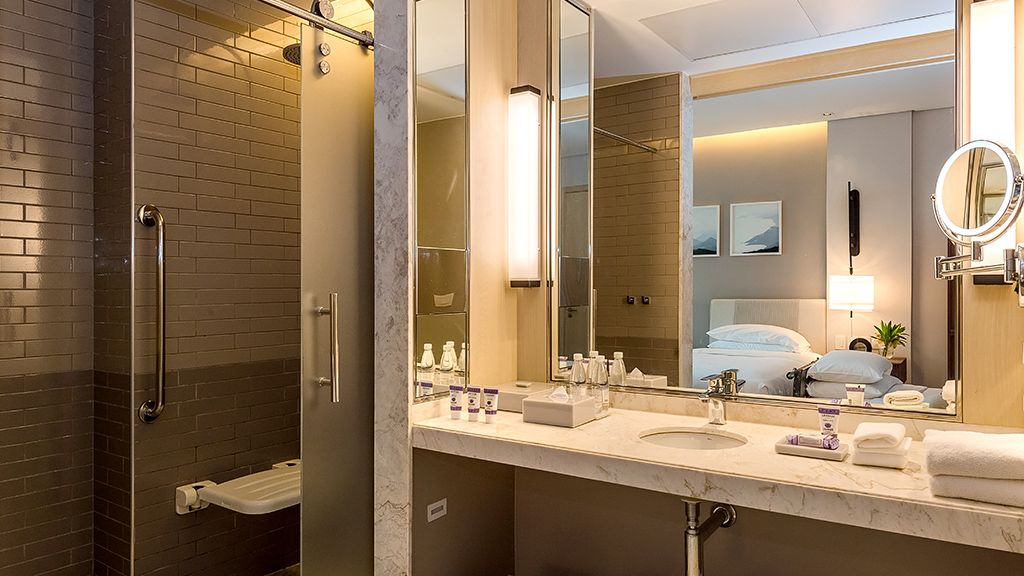 Relax in this spacious room that features a plush king bed, space for an extra bed, a private balcony, an accessible shower, lowered amenities, wide doorways and more.
