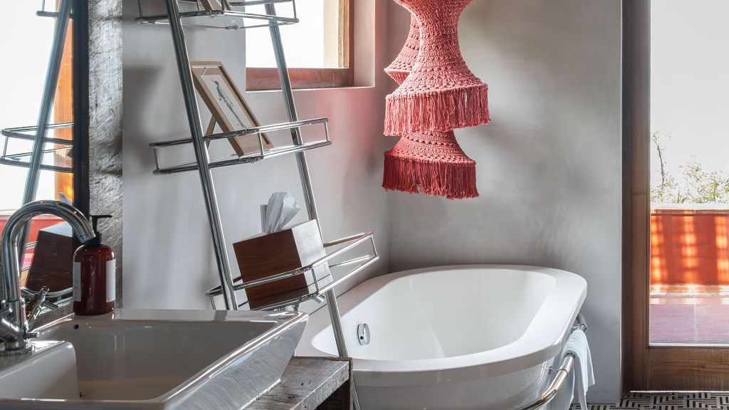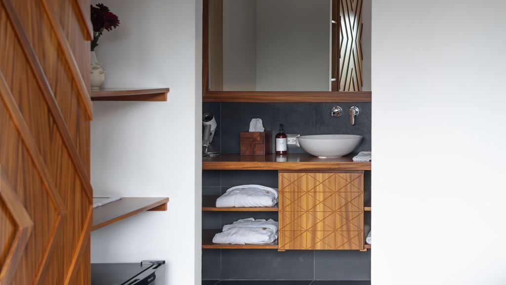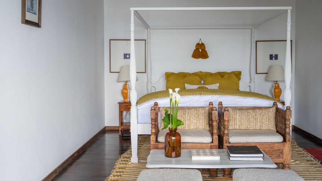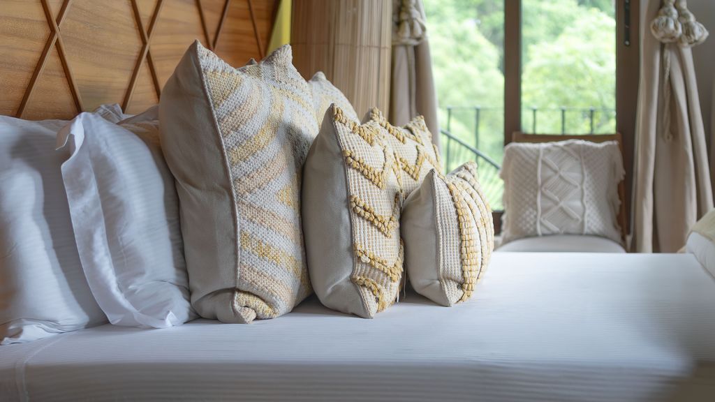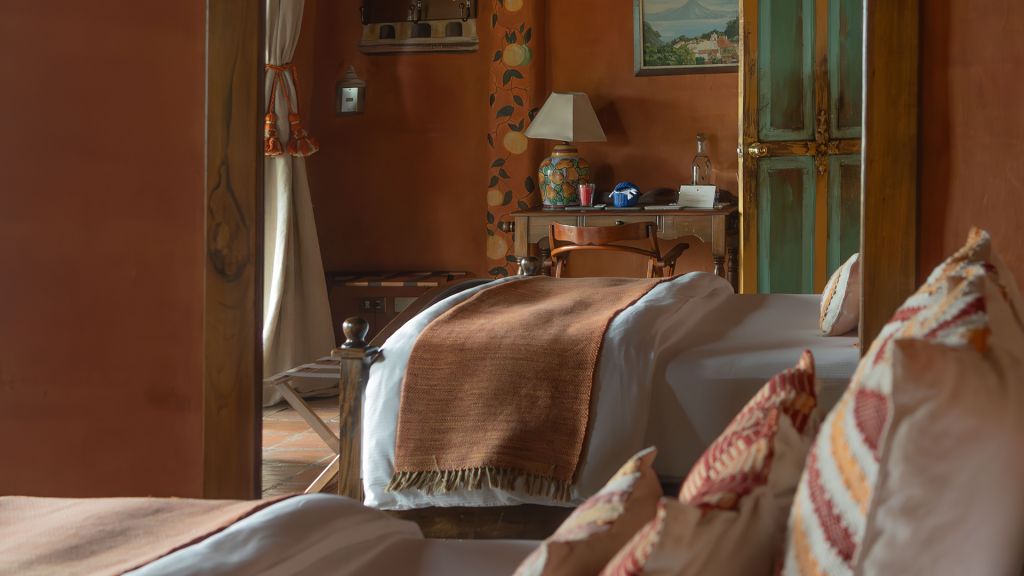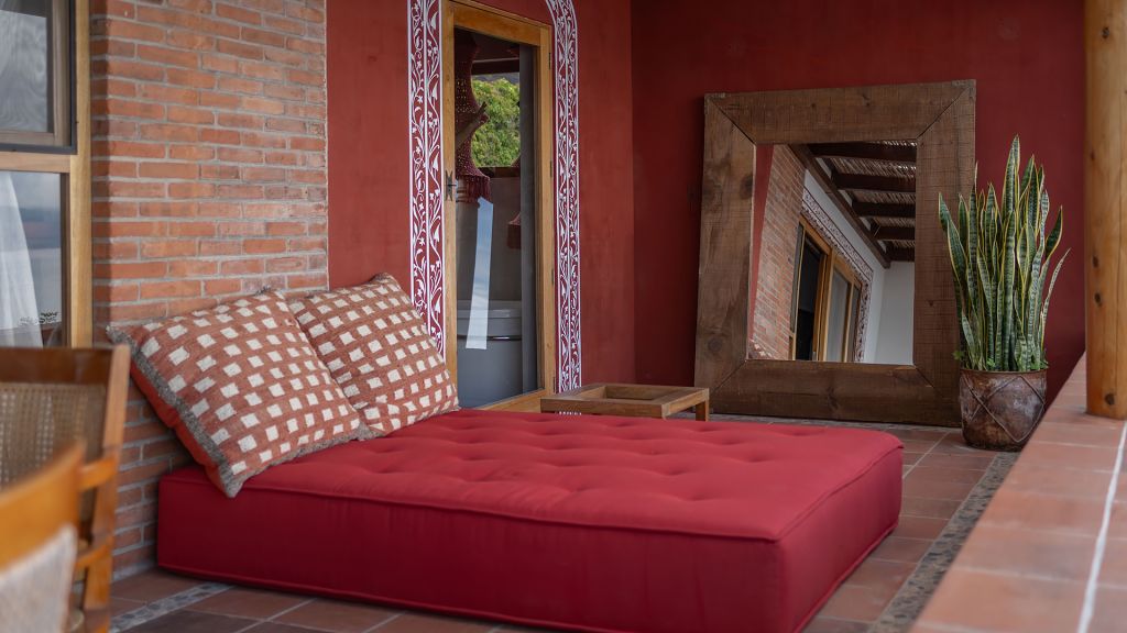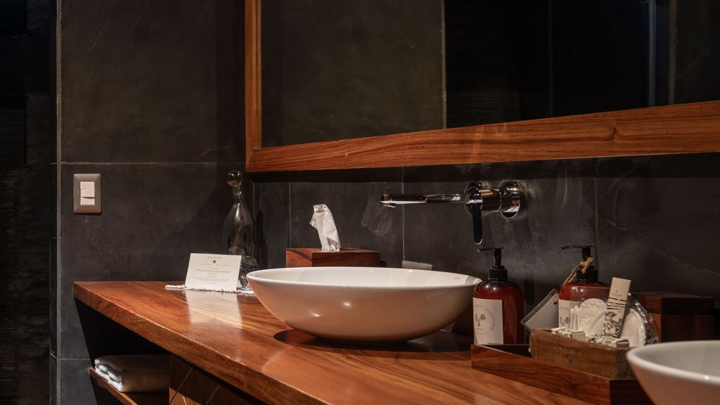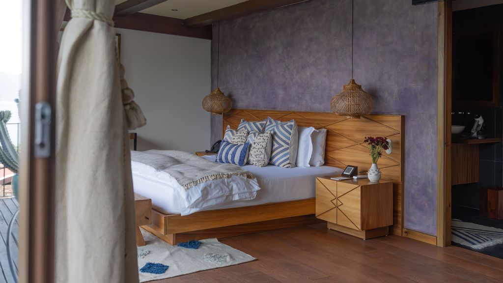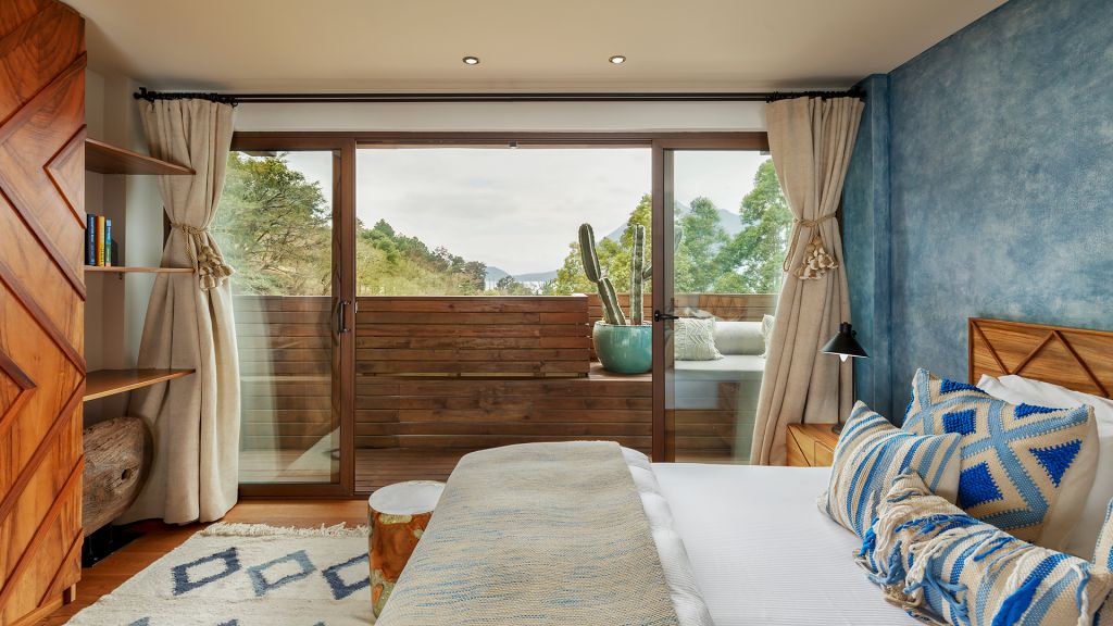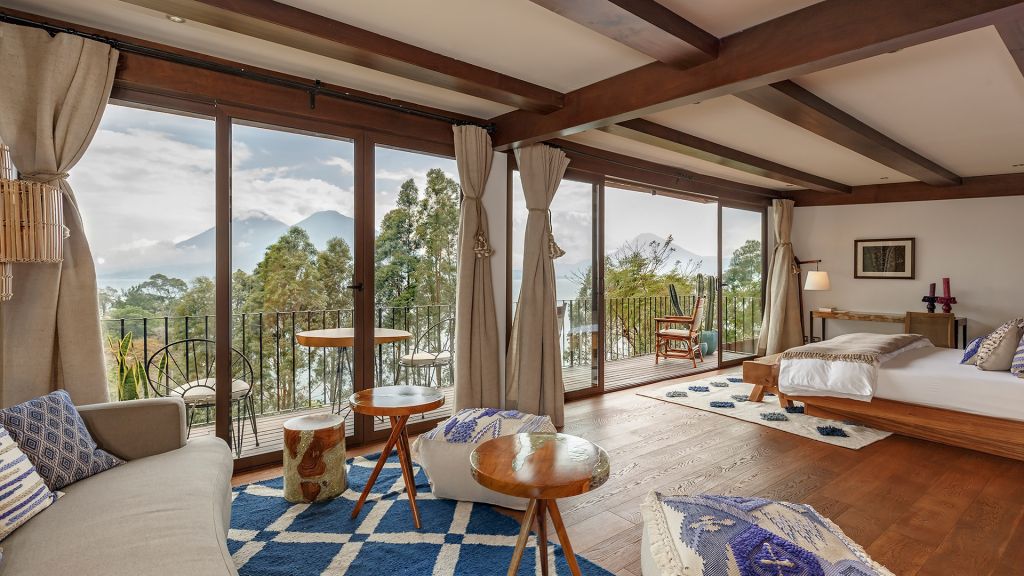 1 king bed – 48sqm /516sqft – sitting area – desk – balcony – lake view – with lavender sponge-painted walls, this suite’s king-sized bed is framed in auburn wood and faces directly toward lake atitlan’s signature views. – lamps hang from the ceilings on each side of the bed, and the adjacent living room area features a large plush sofa and oversized woven sitting pillows with natural wool wrapped mirrors that hang from the walls. A sliding barn door to the bathroom is a focal point of the room. – en-suite bathroom with bath and shower – double vanities – separate toilets – hairdryer – bathrobes and slippers – makena toiletries – complimentary wi-fi – telephone – minibar – safe – minimum age requirement: 10 years and up – 1 extra bed possible – charges apply – 3 persons maximum