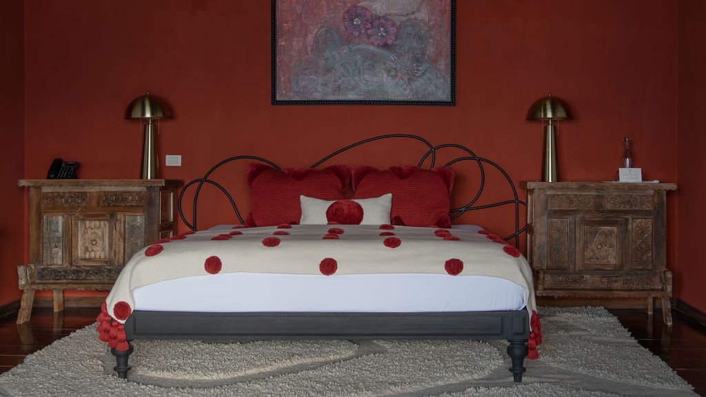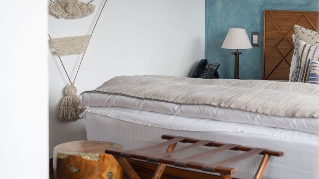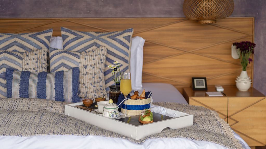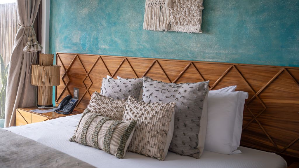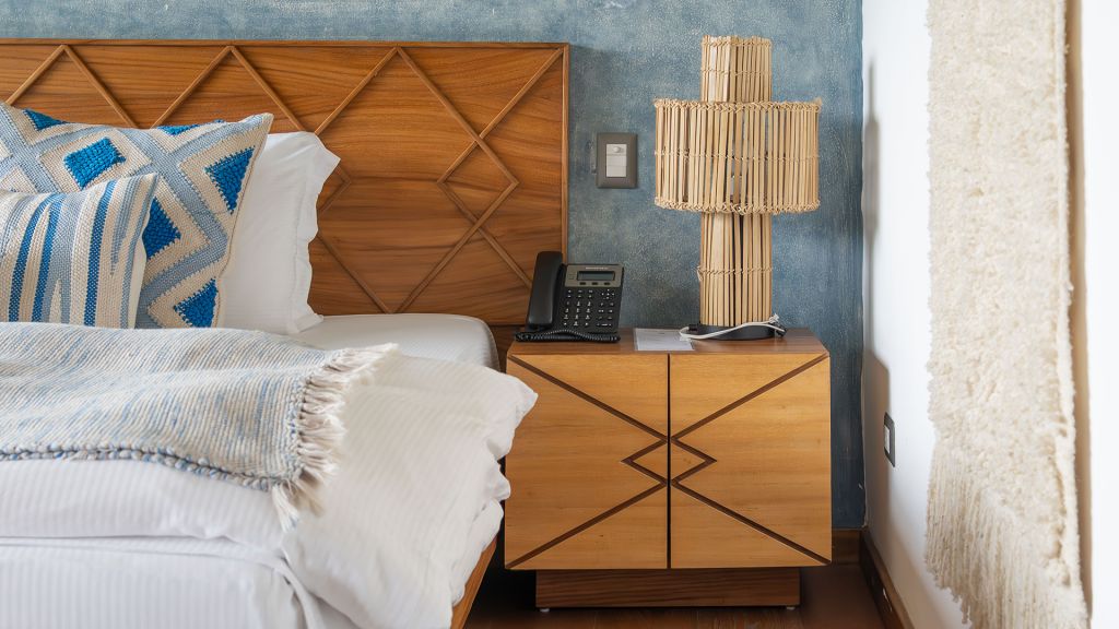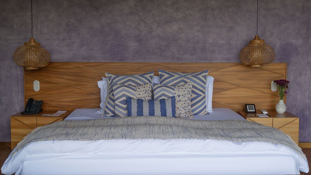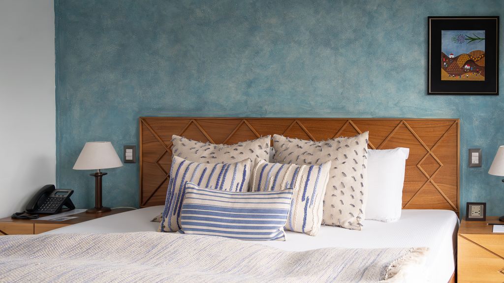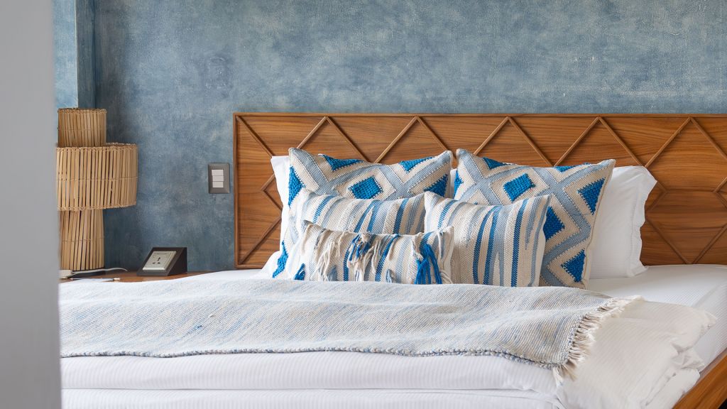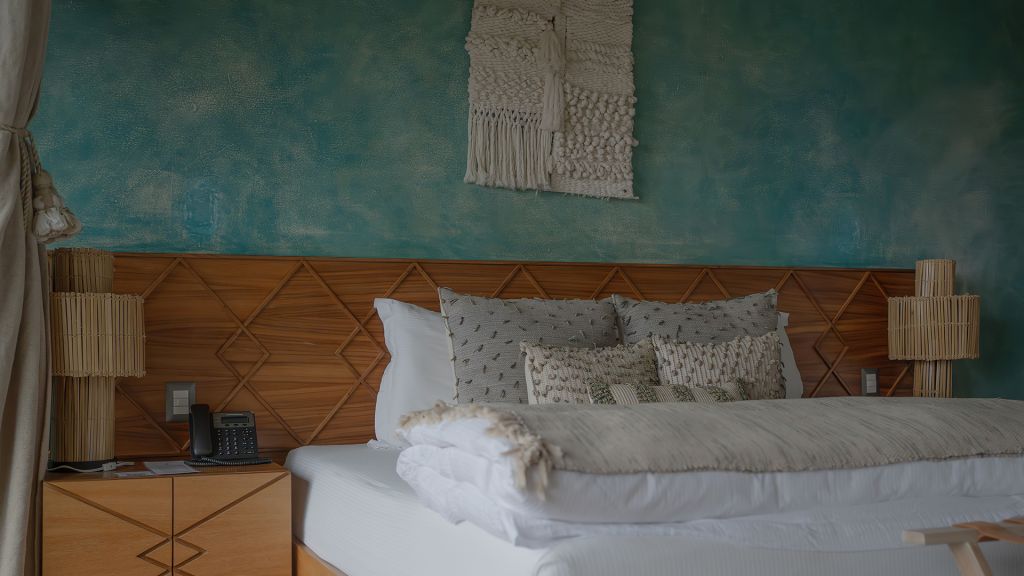 1 king bed – 26sqm / 279sqft – desk – balcony – mountain view – sponged-painted sky-blue suite featuring a king-sized bed next to a grand sliding door; decorated with iron and wool hanging wall décor, hand-crafted wooden nightstands, modern minimalistic lamps, and a one of a kind hand-woven artisan rug. – the balcony offers connecting access to the san andres deluxe suite – located in the pool area – en-suite bathroom with shower – double vanities – separate toilets – hairdryer – bathrobes and slippers – makena toiletries – complimentary wi-fi – telephone – minibar – safe – minimum age requirement: 10 years and up – no extra bed possible – 2 persons maximum