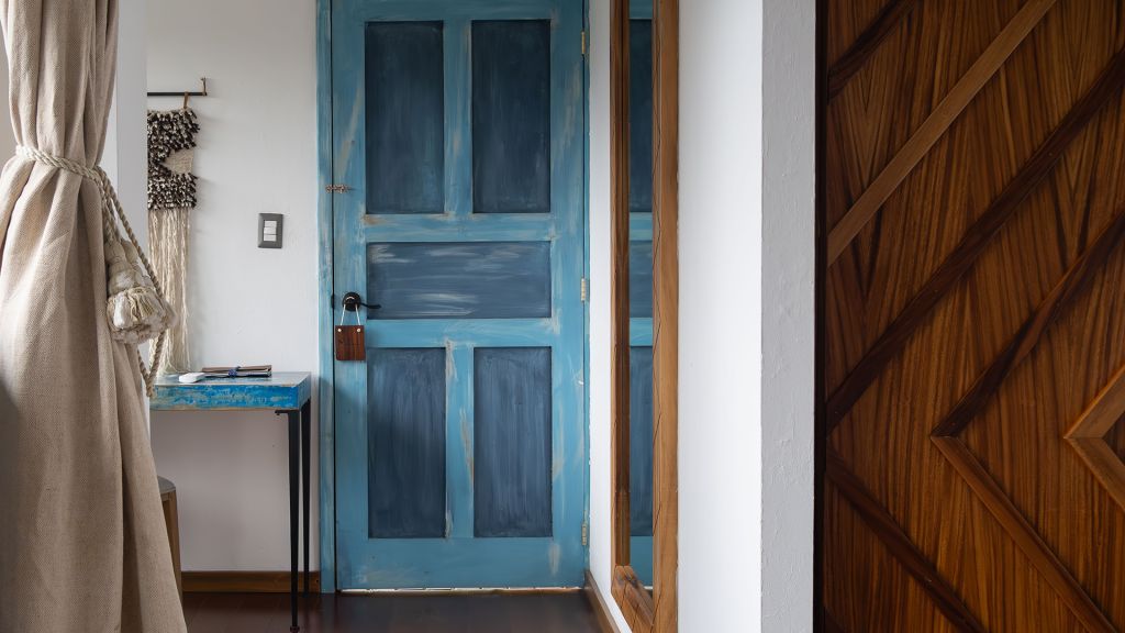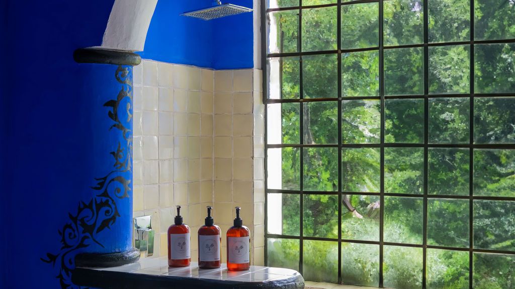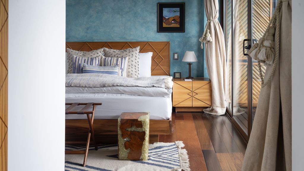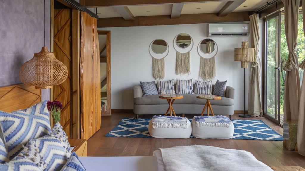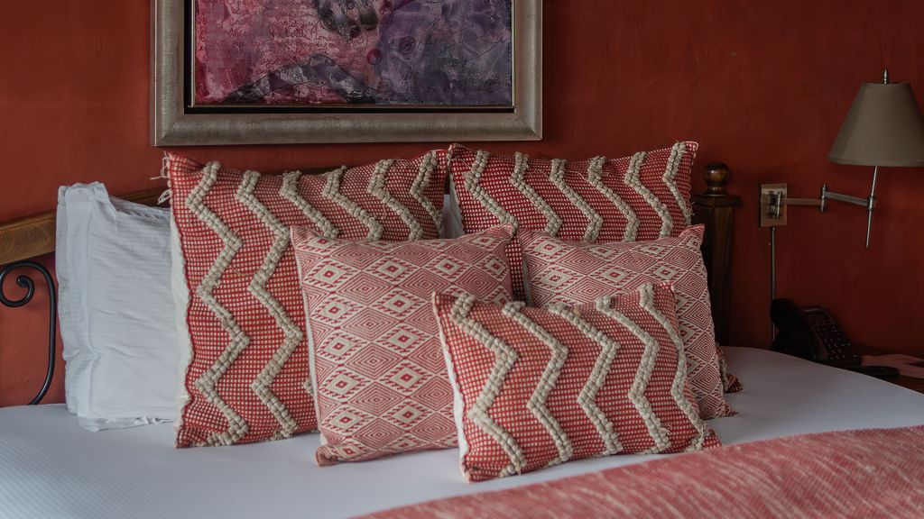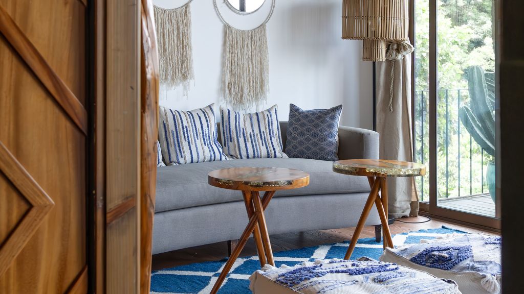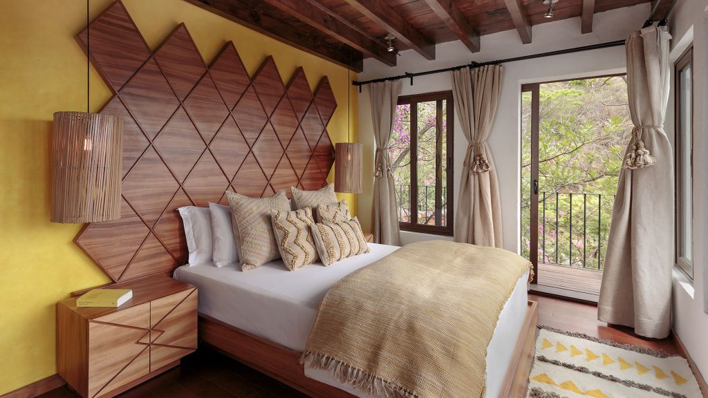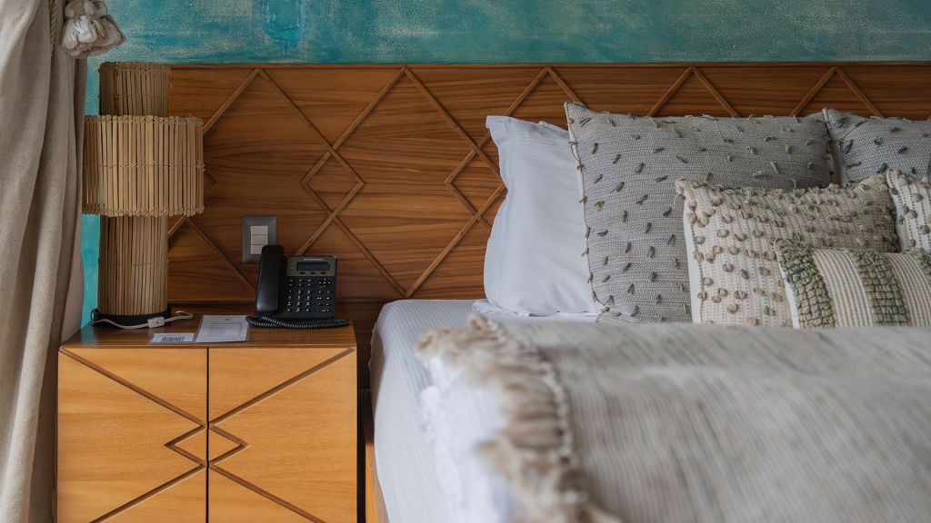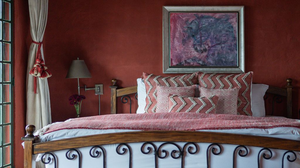 1 king bed – 26sqm / 279sqft – desk – balcony – mountain view – sponged-painted sky-blue suite featuring a king-sized bed next to a grand sliding door; decorated with iron and wool hanging wall décor, hand-crafted wooden nightstands, modern minimalistic lamps, and a one of a kind hand-woven artisan rug. – the balcony offers connecting access to the san andres deluxe suite – located in the pool area – en-suite bathroom with shower – double vanities – separate toilets – hairdryer – bathrobes and slippers – makena toiletries – complimentary wi-fi – telephone – minibar – safe – minimum age requirement: 10 years and up – no extra bed possible – 2 persons maximum