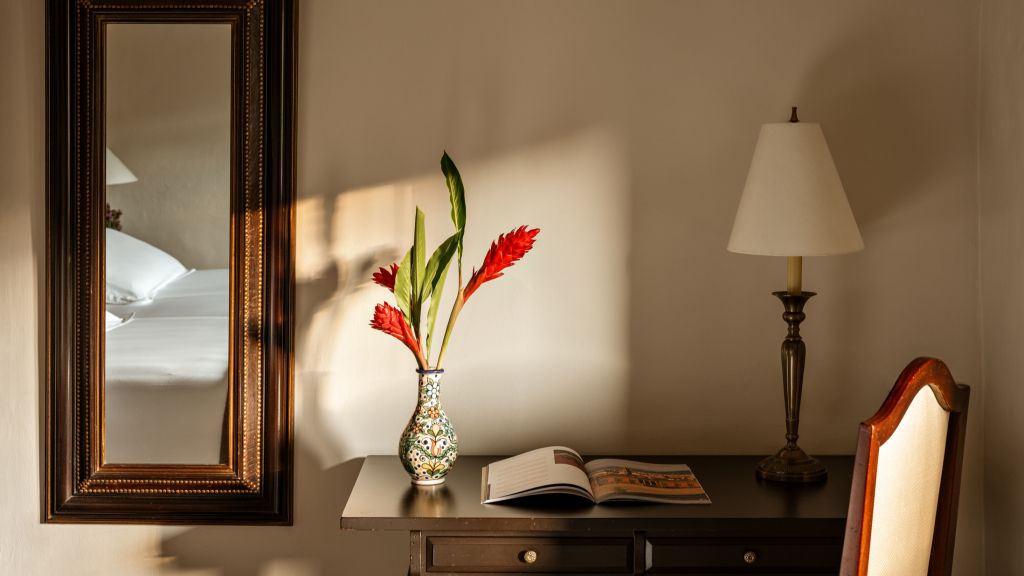 Features 1 King bed or 2 Twin beds, internal view, Colonial decor.