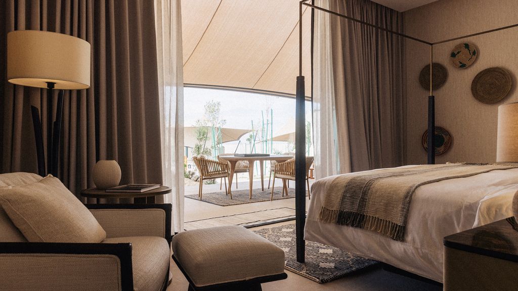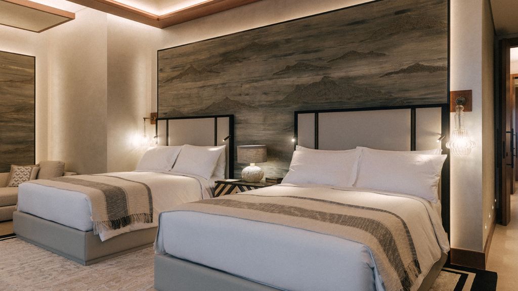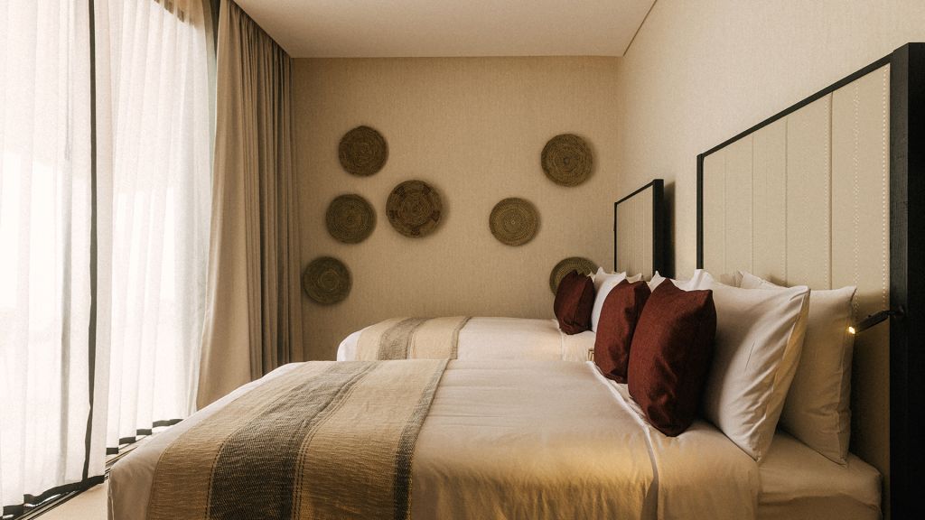 Our reem villa combines opulent space with a private plunge pool to create the perfect retreat. Designed for smaller families or friends embarking on a journey together, this villa boasts two luxurious bedrooms, one furnished with a king-sized bed and the other with two queen-sized beds and an expansive deck that invites day-long lounging and immersion in the natural surroundings. Drawing inspiration from the rich essence of qatar, the decor of all our villas features soothing earthy tones, natural textures and curated local design elements, providing a modern interpretation of the region's cultural tapestry.