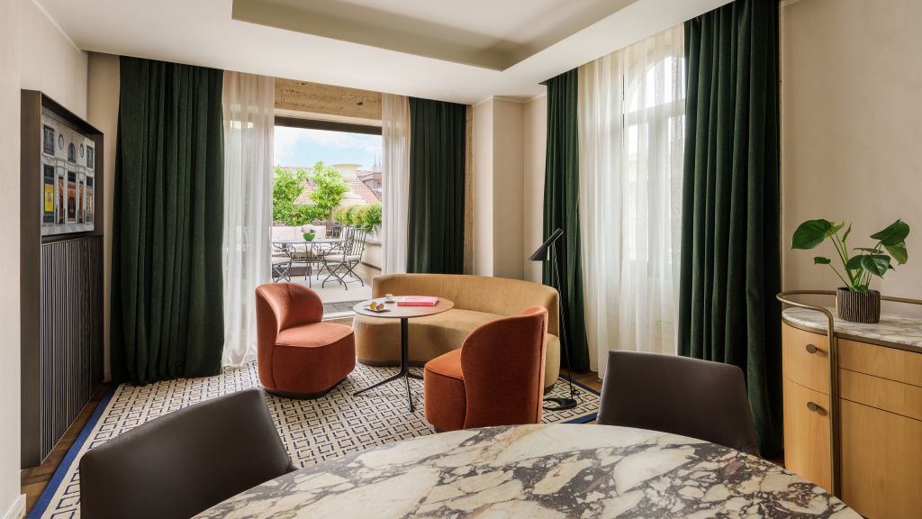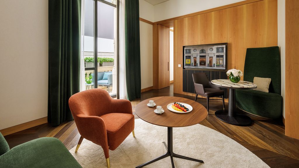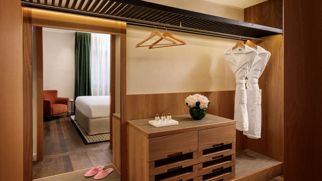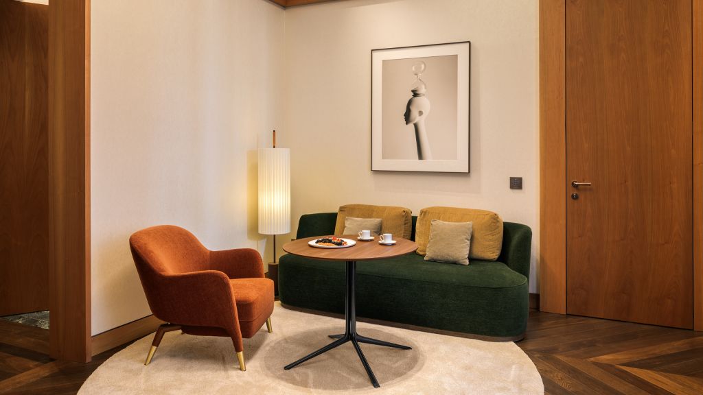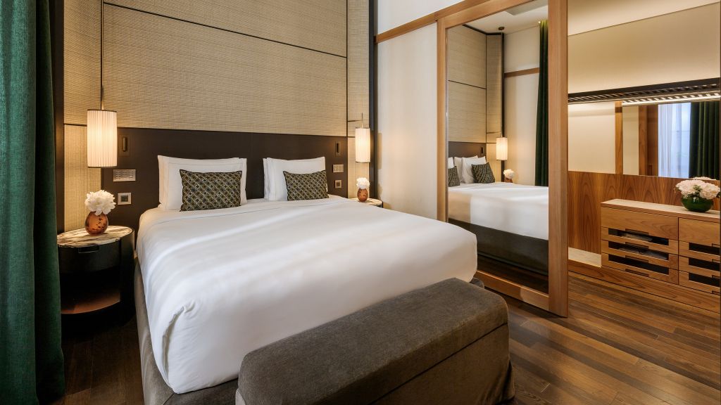 Indulge in this 57 sqm suite which includes a sitting area and separate bedroom featuring a plush king bed and a dedicated workspace area. Decorated with stunning details and original contemporary artworks, this suite embodies Italian artisanal craftmanship and materials such as the luxurious eco-friendly Italian leather on the headboard, intricate and handcrafted mosaics on the table tops. The ample bathroom features Italian marbles, a walk-in rain shower and deep-soaking bathtub, providing the perfect location where to relax.