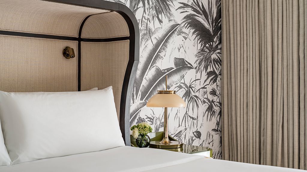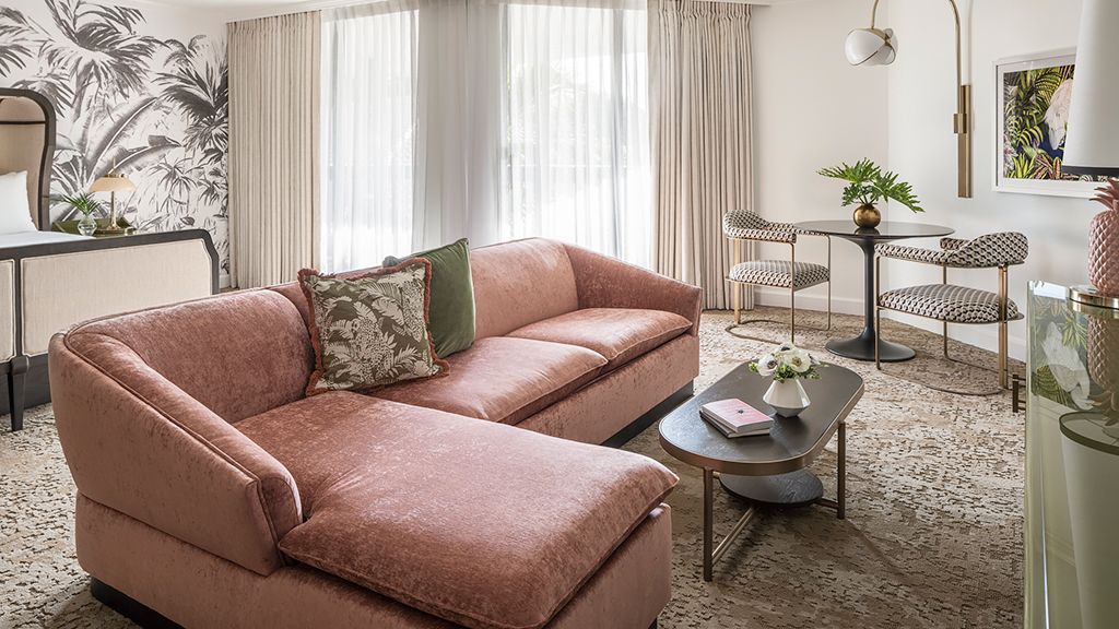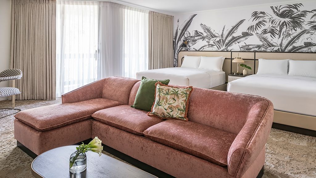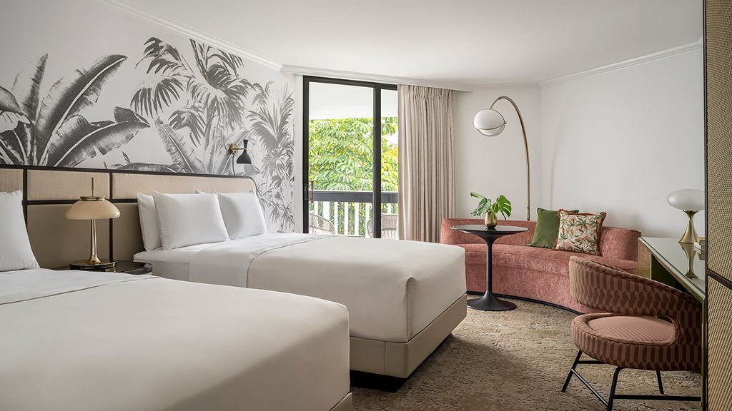 Take in expansive views of the golf course, spa or courtyard from your private, furnished balcony or terrace. Then, unwind in a room showcasing cool tones and clean lines, and a colorfully modern and naturally textural palette with tropical touches. These palm beach deluxe rooms feature two queen beds, custom wood headboards, tropical black and white wall mural, bold color nightstands and media console, pink pineapple lamp, arc lamp, 42’’ lcd hd tv, sitting area, and executive desk. The spa-style bathroom has free-standing metal vanities with white quartz top, custom illuminated mirror, white terrazzo tile floors, black porcelain wall tile, and separate vanity area. • may connect to another deluxe room or premium junior suite • bathrooms feature either a spa-style shower or shower / tub combination