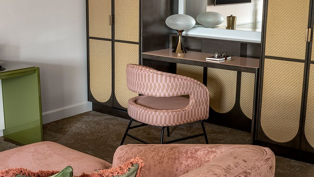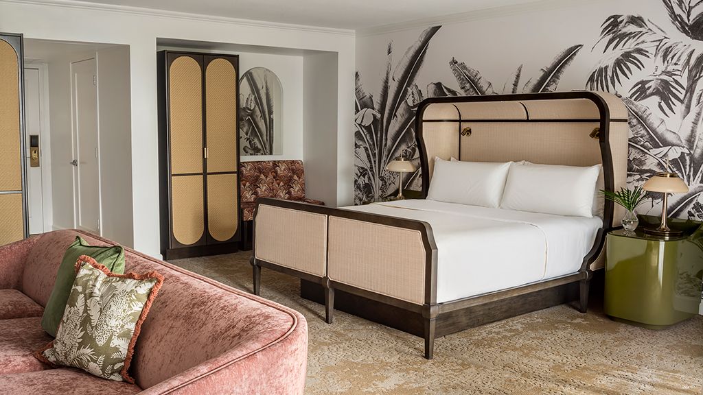 With its cool tones and clean lines, and a colorfully modern and naturally textural palette with tropical touches, this palm beach resort room features a king bed, custom wood headboards, tropical black and white wall mural, bold color nightstands and media console, pink pineapple lamp, arc lamp, 42’’ lcd hd tv, sitting area, and executive desk. The spa-style bathroom has free-standing metal vanities with white quartz top, custom illuminated mirror, white terrazzo tile floors, black porcelain wall tile, and separate vanity area.