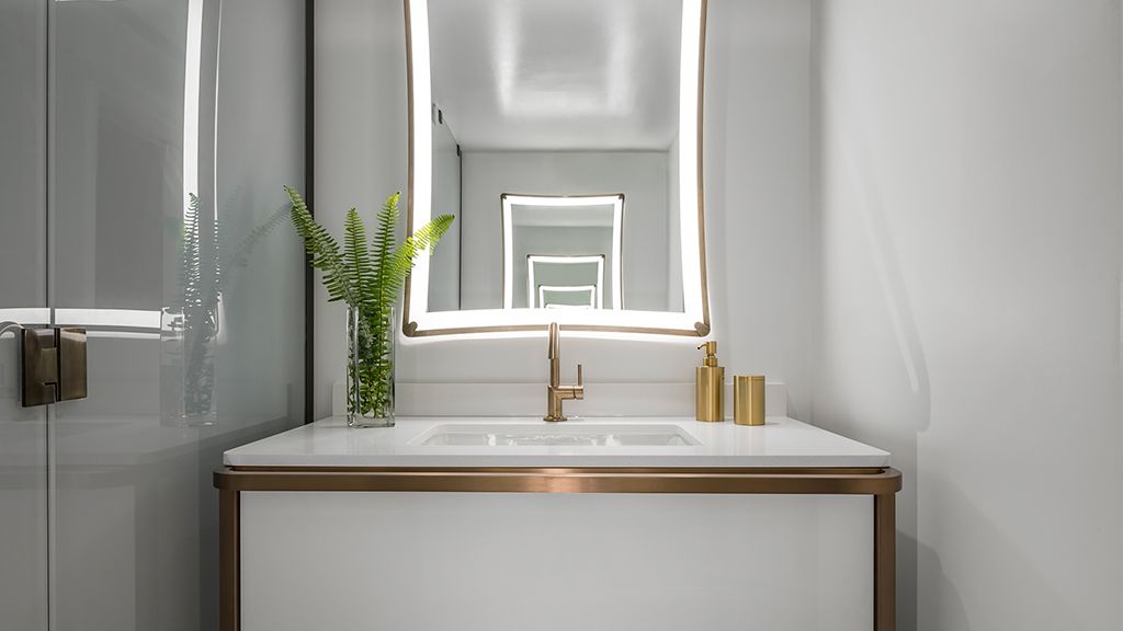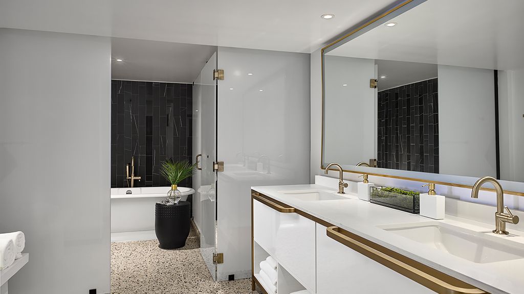 The luxury suite includes a king bed, custom wood headboards, tropical black and white wall mural, bold color nightstands and media console, pink pineapple lamp, arc lamp, 42’’ lcd hd tv, and living area with pull-out sofa bed, small dining table, and four chairs, plus an array of ada-accessible amenities. The spa-style bathroom has free-standing metal vanities with white quartz top, custom illuminated mirror, white terrazzo tile floors, black porcelain wall tile, and separate vanity area. • approximately 429 square feet or 40 square meters • toilet with grab bars • roll-in shower • accessible closet and thermostat control panel • visual fire alarm available upon request • visual doorbell or door-knock indicator available upon request • phone with flashing light when ringing available upon request • outlet within four feet of phone
