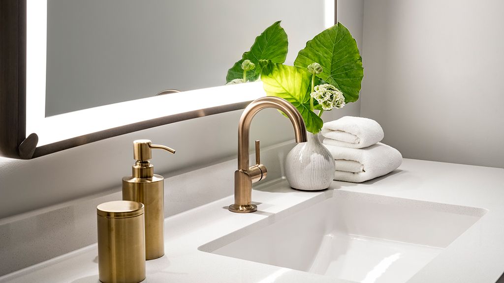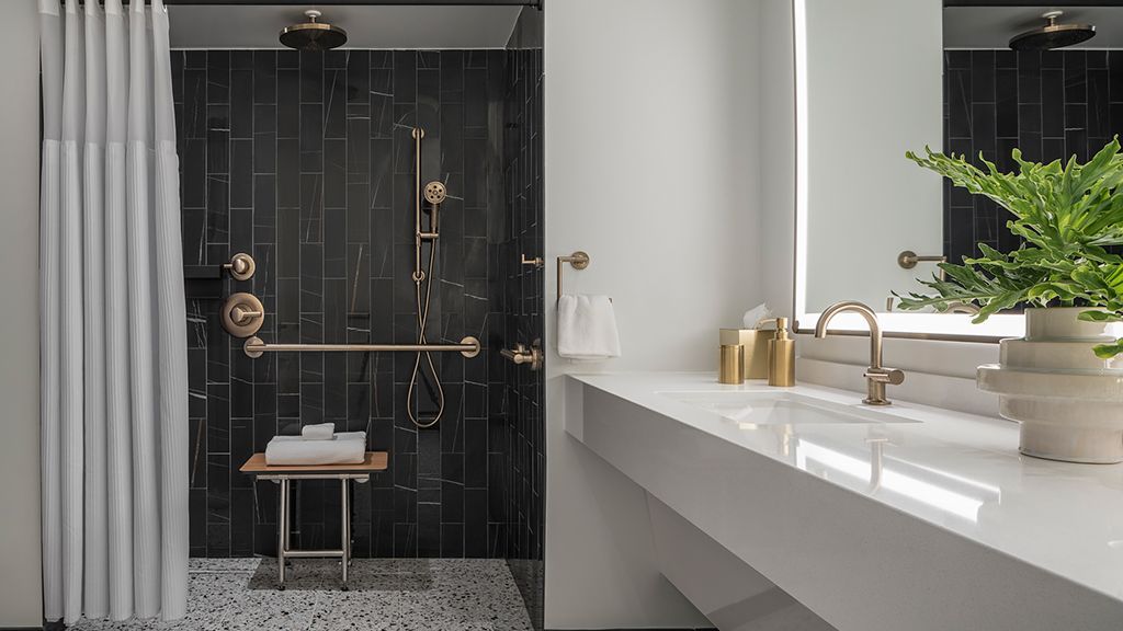 With its cool tones and clean lines, and a colorfully modern and naturally textural palette with tropical touches, this palm beach resort room features a king bed, custom wood headboards, tropical black and white wall mural, bold color nightstands and media console, pink pineapple lamp, arc lamp, 42’’ lcd hd tv, sitting area, and an executive desk, plus an array of ada-accessible amenities. The spa-style bathroom has free-standing m3tal vanities with white quartz top, custom illuminated mirror, white terrazzo tile floors, black porcelain wall tile, and separate vanity area. • roll-in shower or tub with grab bars • accessible closet and thermostat control panel • visual fire alarm available upon request • visual doorbell or door-knock indicator available upon request • phone with flashing light when ringing available upon request • outlet within four feet of phone