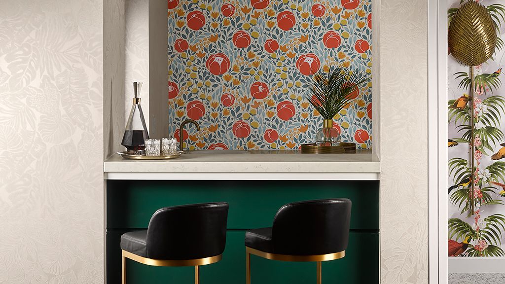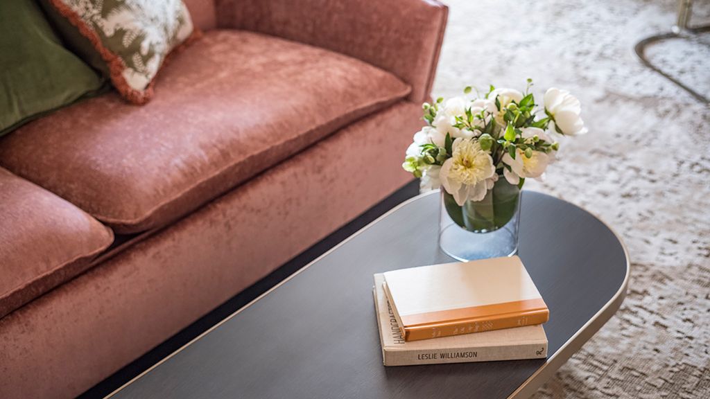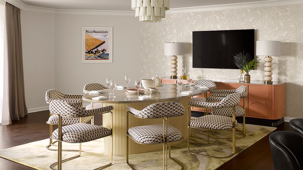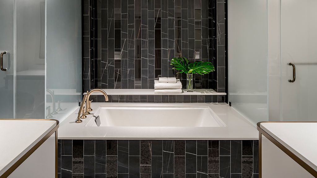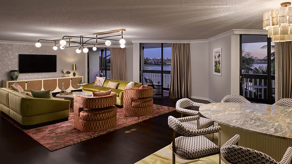 It offers a full living room suitable for entertaining, two 65’’ lcd hd tvs, dining table that seats 8, a kitchenette, and a full bathroom. From the suite’s two large private balconies, enjoy panoramic views of the 18th hole of our champion golf course, pool area, and lake. The private master bedroom features a beautiful king bed, custom wood headboard, tropical black and white wall mural, bold color nightstands and media console, pink pineapple lamp, arc lamp, as well as a sitting area, walk-in closet, and separate dressing area. The master bedroom’s full spa-style bathroom has free-standing metal vanities with white quartz top, large soaking tub, a separate glass-enclosed shower, custom illuminated mirror, white terrazzo tile floors, black porcelain wall tile, and separate vanity area. • approximate size is 1, 443 square feet or 135 square meters • suite may connect to an additional premium pool view room two queens