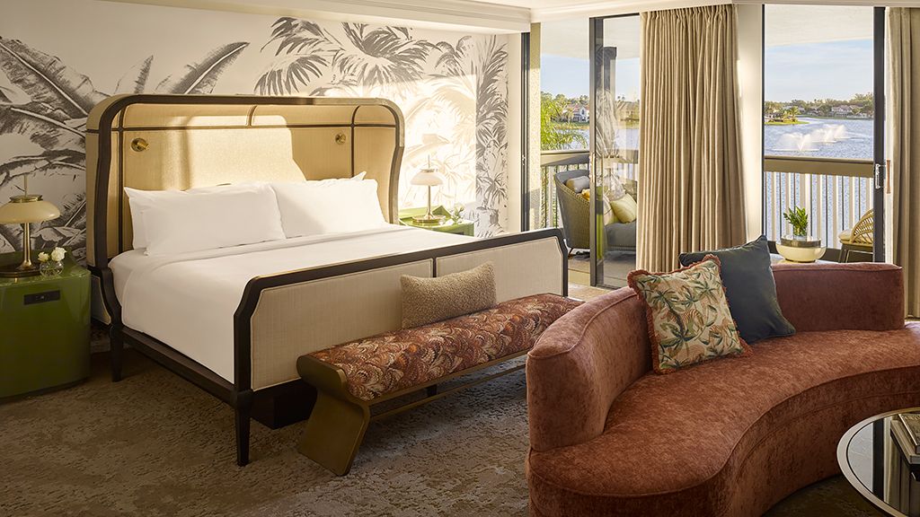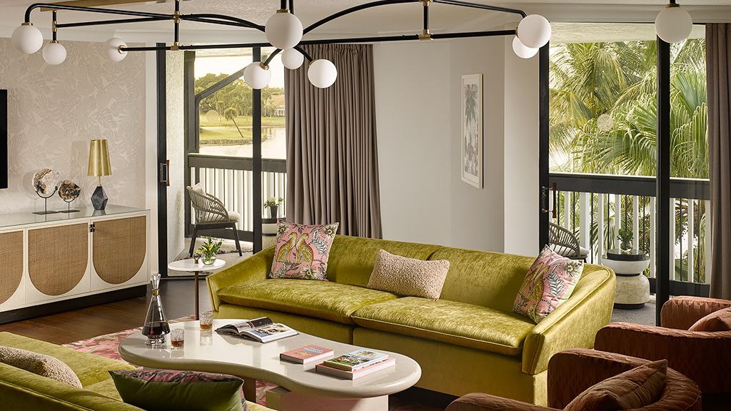 Take in expansive views of the golf course, spa or courtyard from your private, furnished balcony or terrace. Then, unwind in a room showcasing cool tones and clean lines, and a colorfully modern and naturally textural palette with tropical touches. These palm beach deluxe rooms feature a king bed, custom wood headboards, tropical black and white wall mural, bold color nightstands and media console, pink pineapple lamp, arc lamp, 42’’ lcd hd tv, sitting area, and executive desk. The spa-style bathroom has free-standing metal vanities with white quartz top, custom illuminated mirror, white terrazzo tile floors, black porcelain wall tile, and separate vanity area. • may connect to another deluxe room or premium junior suite • bathrooms feature either a spa-style shower or shower / tub combination