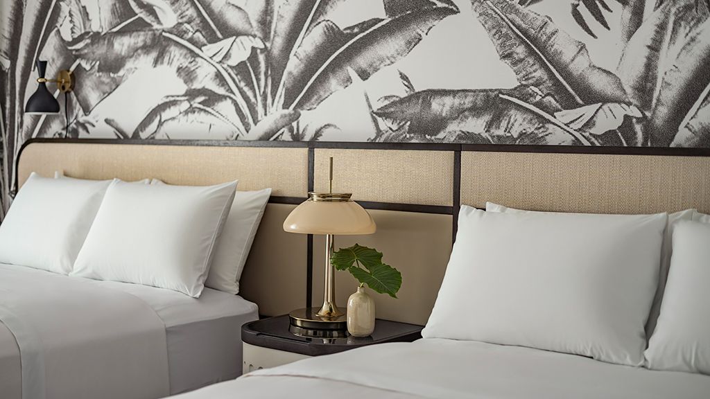 With its cool tones and clean lines, and a colorfully modern and naturally textural palette with tropical touches, this palm beach resort room features 2 queen beds, custom wood headboards, tropical black and white wall mural, bold color nightstands and media console, pink pineapple lamp, arc lamp, 42’’ lcd hd tv, sitting area, and executive desk. The spa-style bathroom has free-standing m3tal vanities with white quartz top, custom illuminated mirror, white terrazzo tile floors, black porcelain wall tile, and separate vanity area. • approximately 392 square feet or 37 square meters • located on floors 1 – 4 • may connect to another resort view room or resort junior suite • bathrooms feature either a spa-style shower or shower / tub combination