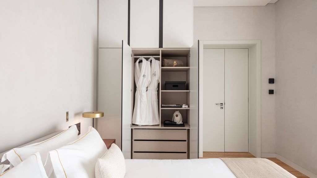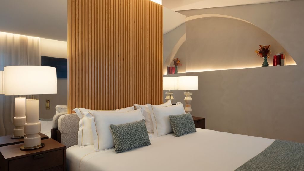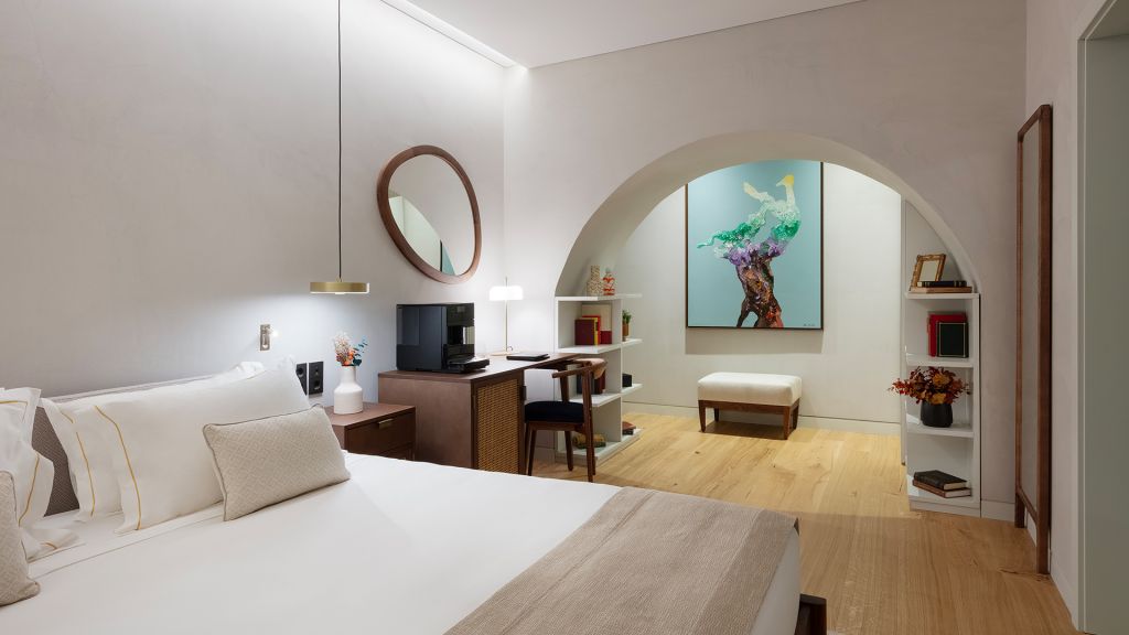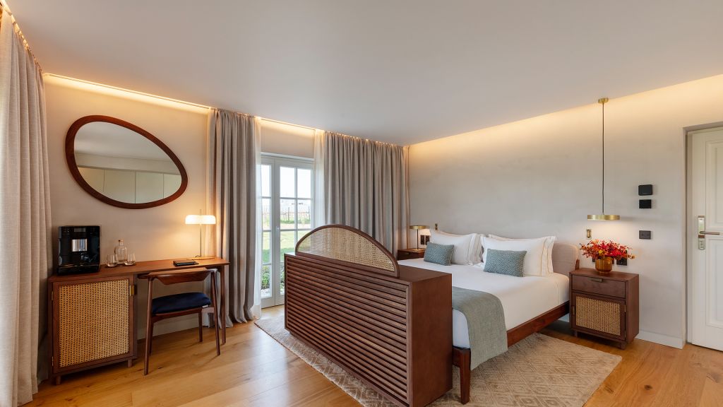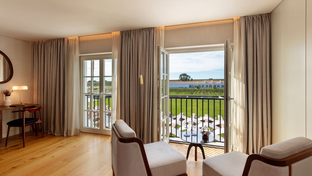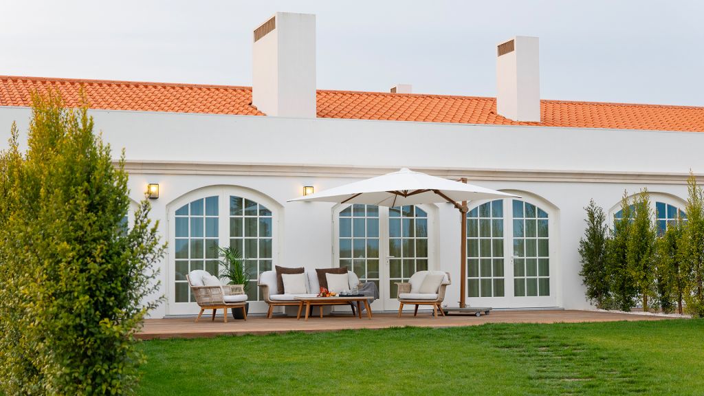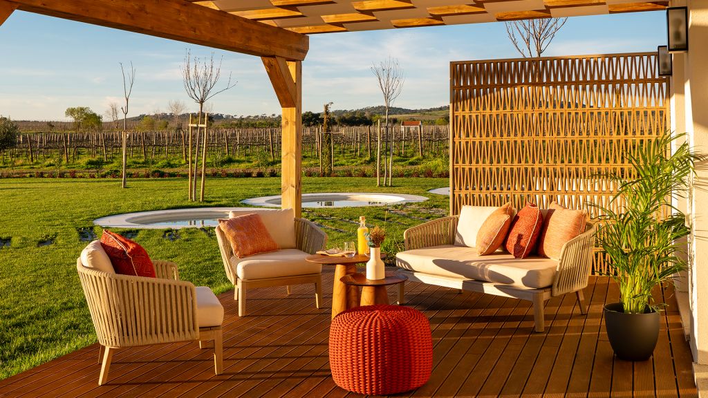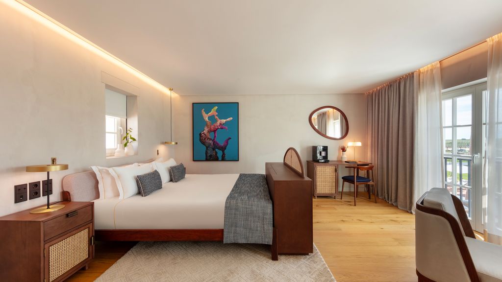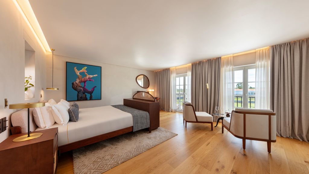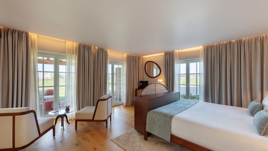 This large open space suite, measuring around 80m2, are located in the central atrium of the property. Inspired by Alentejo´s architectural designs, these units have all the amenities of an apartment, with a queen size bed, complete bathroom with bath and shower, living and leisure area with a comfortable modular sofa, and dining area with a large wooden table. In addition to the minibar, these suites also feature an elegant vertical wine cooler to taste our wines in the comfort and privacy of your suite.