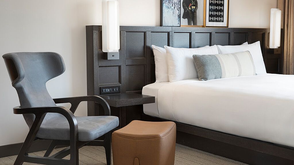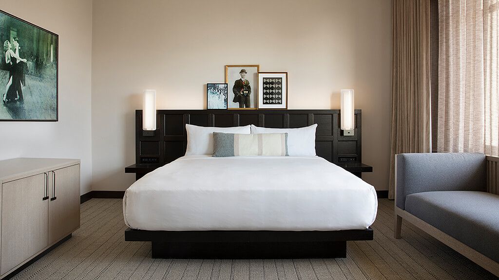 530 sq. Ft. | sleek and modern and reflecting the hotel's historic spirit of design, this recently renovated junior suite features a king bed, armchair, and a work desk and chair. The bathroom offers a walk-in rainfall shower, oversized back-lit wall mirror, and hair dryer. Other amenities include a mini-bar, mini-fridge, keurig coffee maker, laptop-size safe, iron / ironing board, flat-screen television with staycast sonifi streaming, google chromecast, and premium movie channels, and complimentary wi-fi. Hearing accessible features include visual fire alarm and doorbell and phone with flashing light.