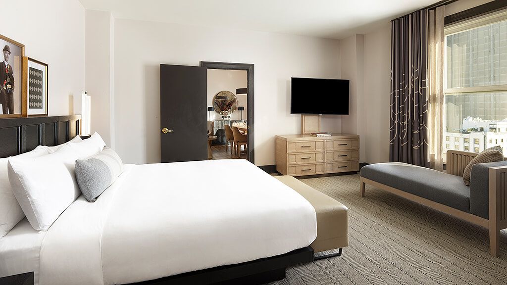 925 sq. Ft. | sleek and modern and reflecting the hotel's historic spirit of design, this recently renovated deluxe suite offers floor-to-ceiling windows, and a private bedroom with one king bed. Suite includes a separate living space, dressing area, dining table and six chairs, sofa, and a work desk and chair. The bathroom offers a walk-in rainfall shower, oversized back-lit wall mirror, robes and slippers, and hair dryer. Other amenities include a mini-bar, mini-fridge, keurig coffee maker, laptop-size safe, iron / ironing board, flat-screen television with staycast sonifi streaming, google chromecast, and premium movie channels, and complimentary wi-fi.