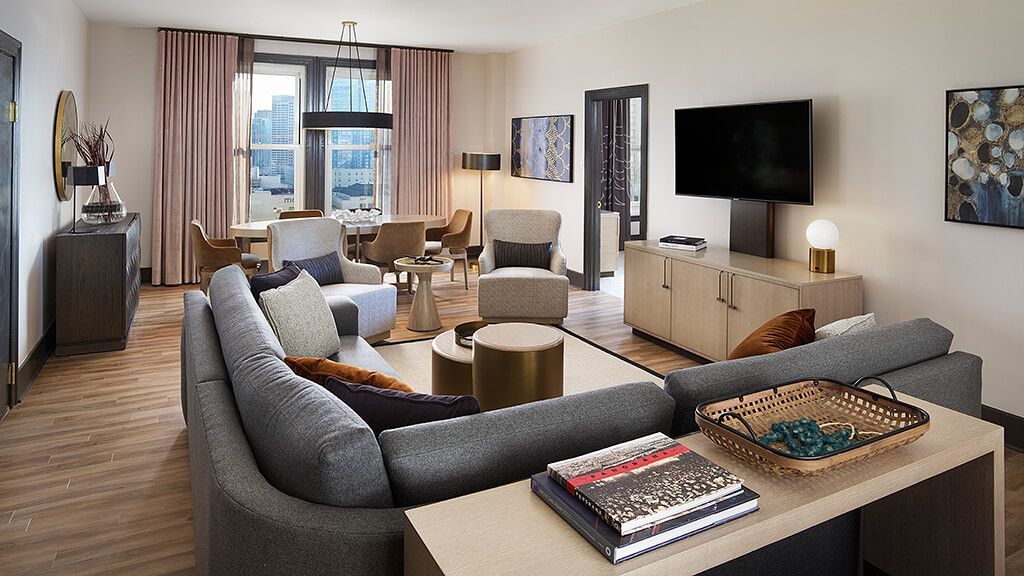 925 sq. Ft. | sleek and modern and reflecting the hotel's historic spirit of design, this recently renovated deluxe one bedroom suite offers a private bedroom with one king bed. Suite includes a separate living space with dressing area, dining table and six chairs, sofa, and a work desk and chair. The bathroom offers a walk-in rainfall shower, oversized back-lit wall mirror, robes and slippers, and hair dryer. Other amenities include a mini-bar, mini-fridge, keurig coffee maker, laptop-size safe, iron / ironing board, flat-screen television with staycast sonifi streaming, google chromecast, and premium movie channels, and complimentary wi-fi. Mobility accessible features include lowered peephole, light switches, and thermostat; barrier free design; and bathroom with tub and grab bars.
