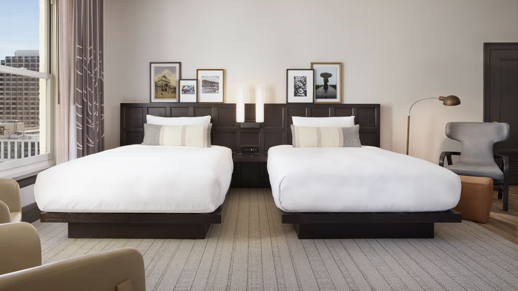 315 sq. Ft. | sleek and modern and reflecting the hotel's historic spirit of design, this recently renovated executive room features two queen beds and a work desk and chair. Other amenities include a mini-bar, mini-fridge, keurig coffee maker, laptop-size safe, oversized back-lit wall mirror, hair dryer, iron / ironing board, flat-screen television with staycast sonifi streaming, google chromecast, and premium movie channels, and complimentary wi-fi. Mobility accessible features include widened doorways; barrier-free design; adjusted counter height; lowered peephole, light switches and thermostat; and bathroom with tub and grab bars.