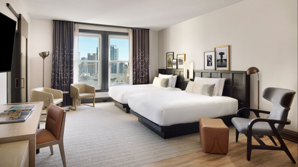425 sq. Ft. | sleek and modern and reflecting the hotel's historic spirit of design, this recently renovated executive room features two queen beds and a work desk and chair. The bathroom offers a walk-in rainfall shower, oversized back-lit wall mirror, and hair dryer. Other amenities include a mini-bar, mini-fridge, keurig coffee maker, laptop-size safe, iron / ironing board, flat-screen television with staycast sonifi streaming, google chromecast, and premium movie channels, and complimentary wi-fi.