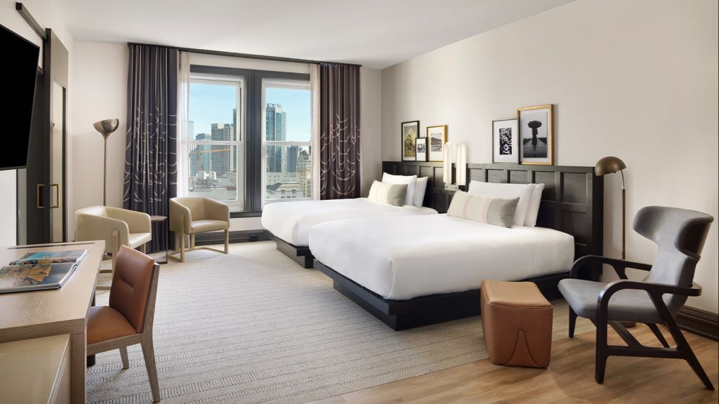 530 sq. Ft. | sleek and modern and reflecting the hotel's historic spirit of design, this recently renovated junior suite features two queen beds, sofa bed, armchair, and a work desk and chair. The bathroom offers a walk-in rainfall shower, oversized back-lit wall mirror, and hair dryer. Other amenities include a mini-bar, mini-fridge, keurig coffee maker, laptop-size safe, iron / ironing board, flat-screen television with staycast sonifi streaming, google chromecast, and premium movie channels, and complimentary wi-fi.