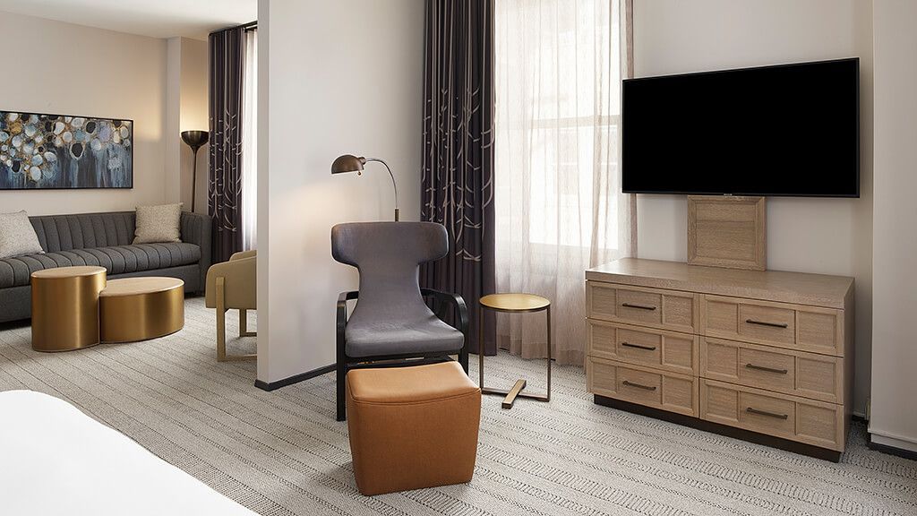 530 sq. Ft. | sleek and modern and reflecting the hotel's historic spirit of design, this recently renovated junior suite features a king bed, sofa bed, armchair, and a work desk and chair. The bathroom offers a walk-in rainfall shower, oversized back-lit wall mirror, and hair dryer. Other amenities include a mini-bar, mini-fridge, keurig coffee maker, laptop-size safe, iron / ironing board, flat-screen television with staycast sonifi streaming, google chromecast, and premium movie channels, and complimentary wi-fi. Mobility accessible features include widened doorways, lowered peephole, and bathroom with roll-in shower and grab bars.