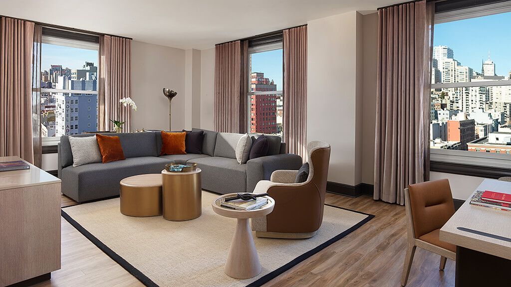 530 sq. Ft. | sleek and modern and reflecting the hotel's historic spirit of design, this recently renovated junior suite features a king bed, sofa bed, armchair, and a work desk and chair. The bathroom offers a walk-in rainfall shower, oversized back-lit wall mirror, and hair dryer. Other amenities include a mini-bar, mini-fridge, keurig coffee maker, laptop-size safe, iron / ironing board, flat-screen television with staycast sonifi streaming, google chromecast, and premium movie channels, and complimentary wi-fi. Mobility accessible features include widened doorways; barrier-free design; lowered peephole, light switches and thermostat; and bathroom with roll-in shower and grab bars. Hearing accessible features include visual fire alarm and doorbell and phone with flashing light.