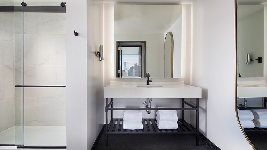 530 sq. Ft. | sleek and modern and reflecting the hotel's historic spirit of design, this recently renovated junior suite features a king bed, sofa bed, and a work desk and chair. The bathroom offers a walk-in rainfall shower, oversized back-lit wall mirror, and hair dryer. Other amenities include a mini-bar, mini-fridge, keurig coffee maker, laptop-size safe, iron / ironing board, flat-screen television with staycast sonifi streaming, google chromecast, and premium movie channels, and complimentary wi-fi.